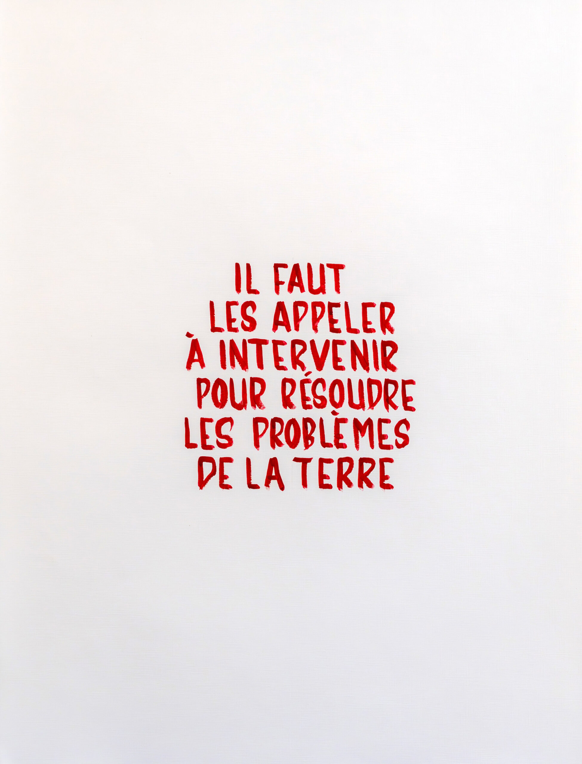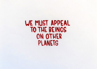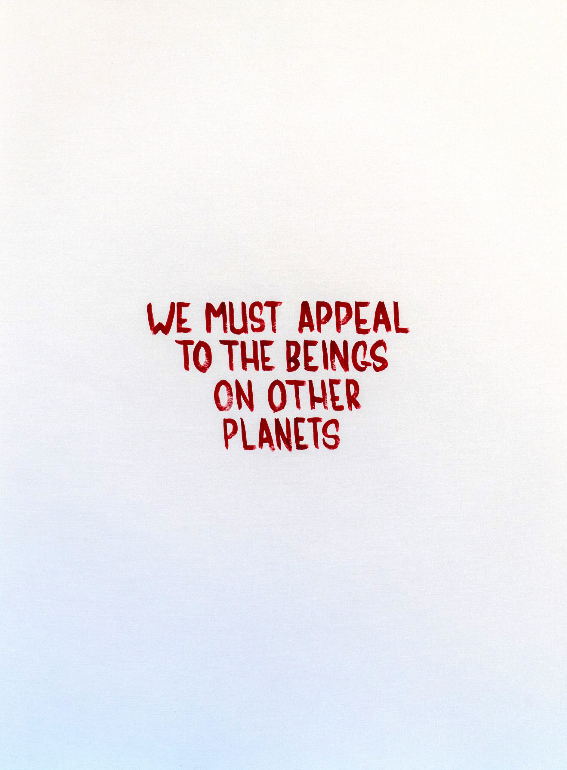 Formally, the installation at EMMA (opening in April 2026) combines two elements: large, hand-lettered linen banners quoting Posadas’ speech, and a constellation of suspended video screens showing interviews with Trotskyist activists, historians, SETI scientists, and UFO contactees. Visitors will move through a darkened space like navigators in a lost ideological galaxy, encountering fragments of political oratory, speculation, and testimony. The design draws inspiration from traditions of political murals, Trotskyist iconography, and the visual language of speculative science fiction.