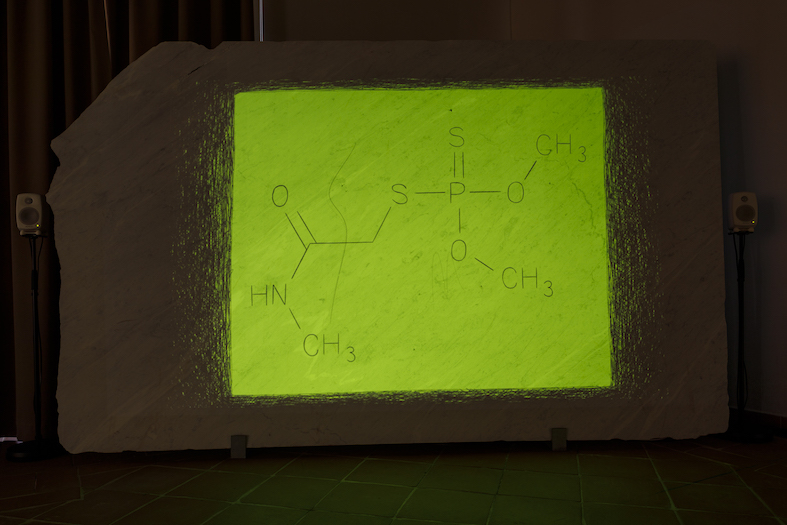 L’installazione audio-video site specific di Eleonora Roaro, articolata in dodici parti corrispondenti ai brani dalle sonorità industrial realizzati dal musicista Emiliano Bagnato – che intrecciano parti strumentali, sintetizzatori, field recording e canzoni – ripercorre i passaggi chiave della storia della Zona Industriale Apuana dall’epoca fascista a oggi. Ne emerge una riflessione sull’impatto ambientale e sociale del boom economico e sulle narrazioni post-verità costruite da media e industrie per interessi politici ed economici.
